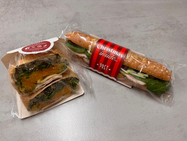 What’s in it: One sandwich is pigs under blankets (AKA sausage and bacon) with cranberry chutney and mayonnaise on malted bread, while the other is brie and cranberry chutney with spinach on malted bread.