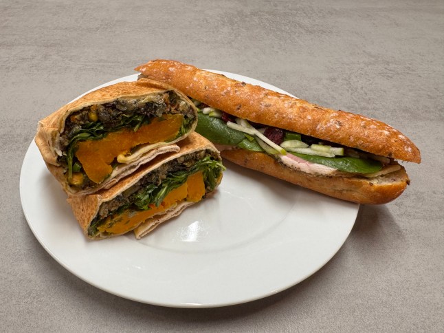 What’s in it: A tortilla wrap is filled with parsnip fritters, red cabbage, and apple, as well as cranberry sauce, toasted pumpkin seeds, vegan sage and onion mayonnaise and spinach.