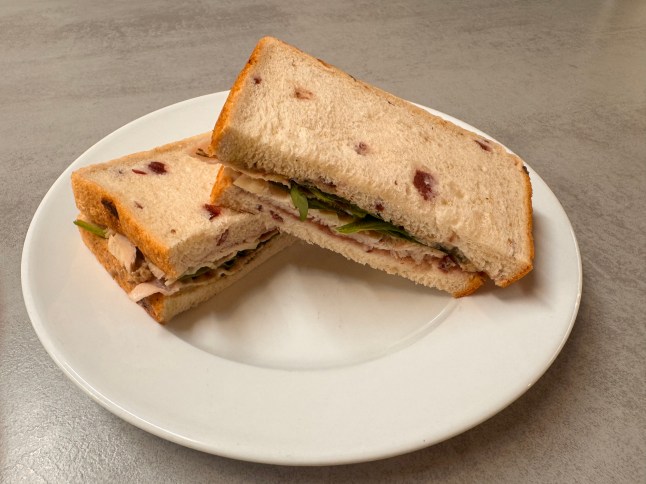 What’s in it? Pork sausage, bacon and cranberry sauce on malted bread.